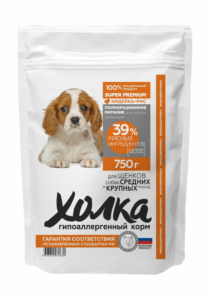 Холка гипоаллергенный сухой корм для щенков средних и крупных пород с индейкой и рисом - 750 г