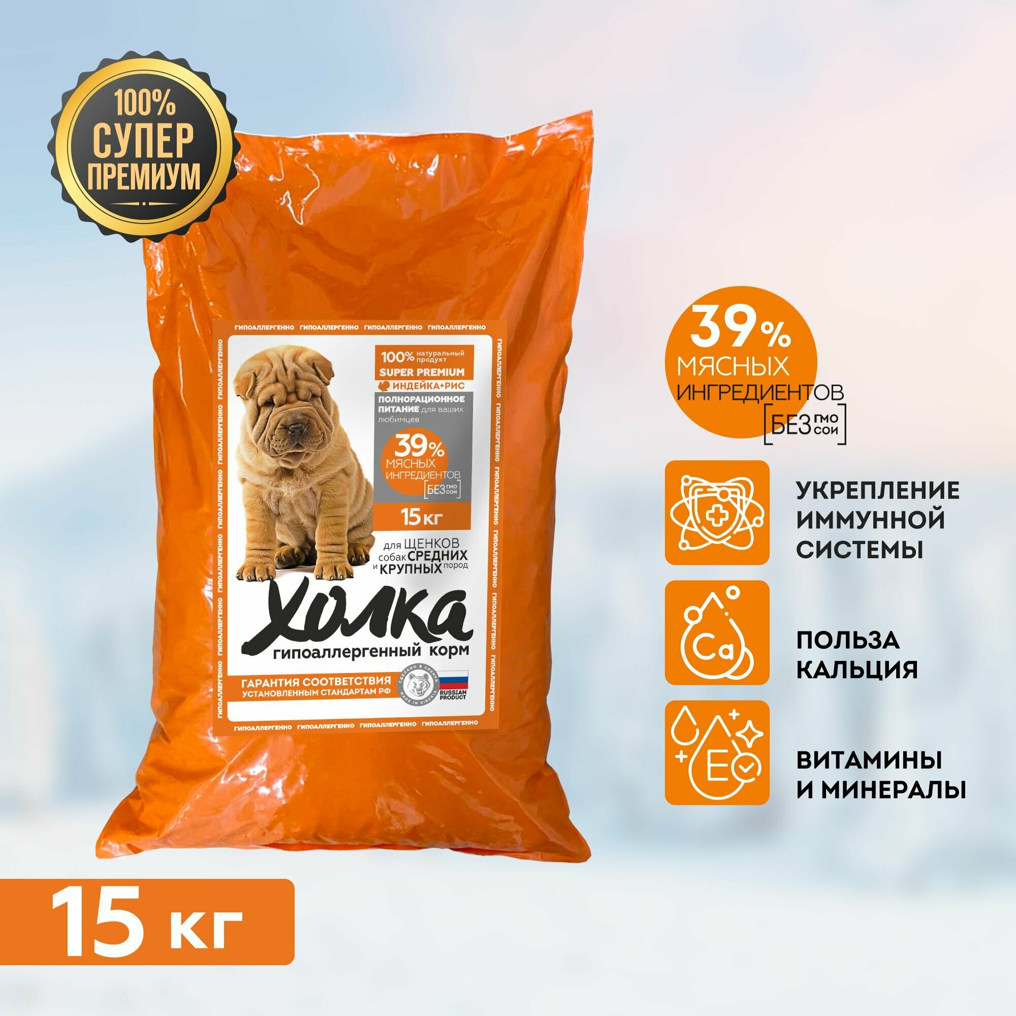 Купить Гипоаллергенный полнорационный корм "Холка" для щенков средних и крупных пород из индейки и риса, 15 кг