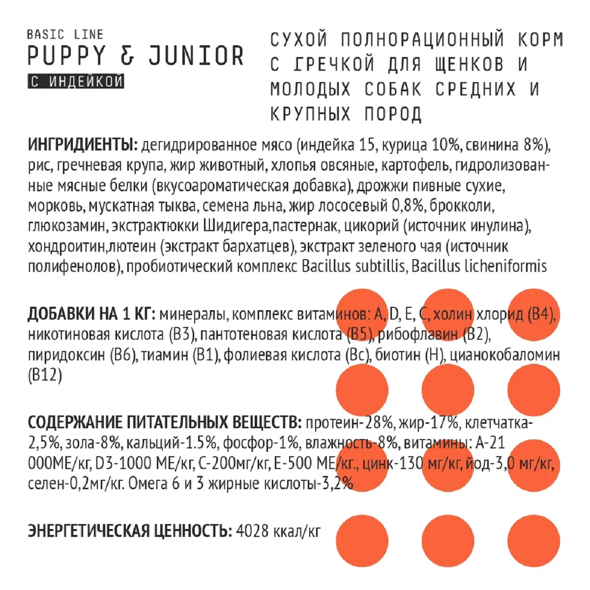 | Состав | дегидрированное мясо (индейка 15,курица 10%,свинина 8%), рис,гречневая крупа, жир животный, хлопья овсяные,картофель, гидролизованные мясные белки (вкусоароматическая добавка),дрожжи пивные сухие,морковь,мускатная тыква,семена льна, жир лососевый 0,8%, брокколи,глюкозамин,экстрактюкки Шидигера,пастернак,цикорий (источник инулина),хондроитин,лютеин (экстракт бархатцев),экстрактзеленого чая (источник полифенолов), пробиотический комплекс Bacillus subtillis, Bacillus licheniformis |