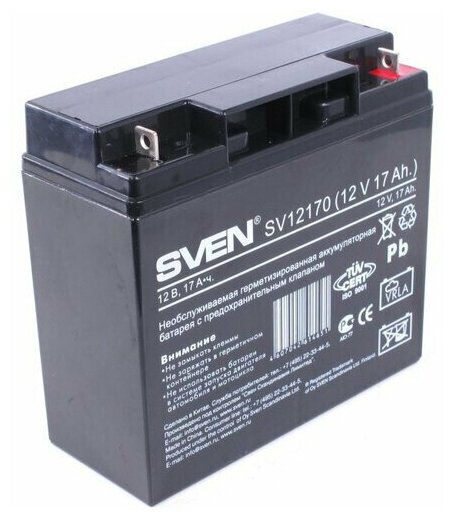 Аккумуляторная батарея SVEN SV-12170 Батарея 12V 17Ah, напряжение 12В, емкость 17А*ч, макс. ток разряда 225А, макс. ток заряда 5.1А, свинцово-кислотная типа AGM, тип клемм T1