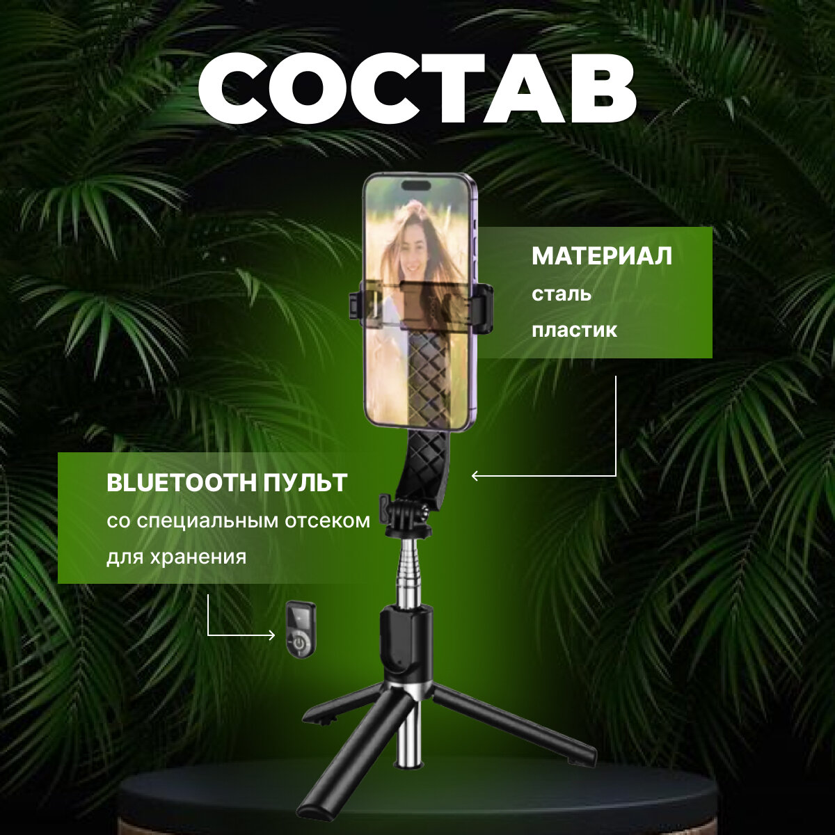 Селфи палка трипод-тренога для телефона со стабилизатором с блютуз кнопкой интересное: