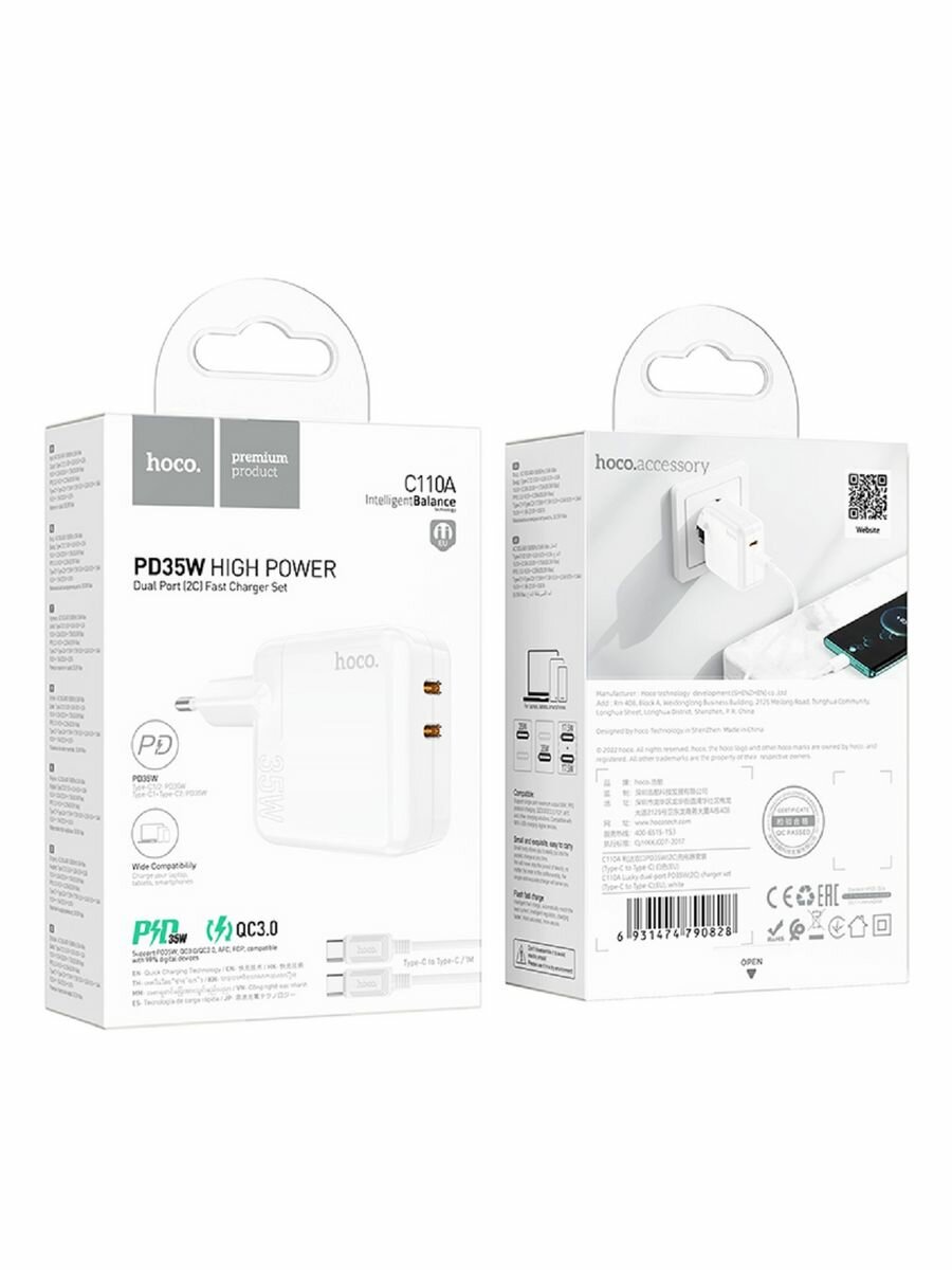 Сетевое зарядное устройство HOCO C110A Lucky 2xUSB-C с Кабелем Type-C - Lightning, 3.0A, 35W, белый