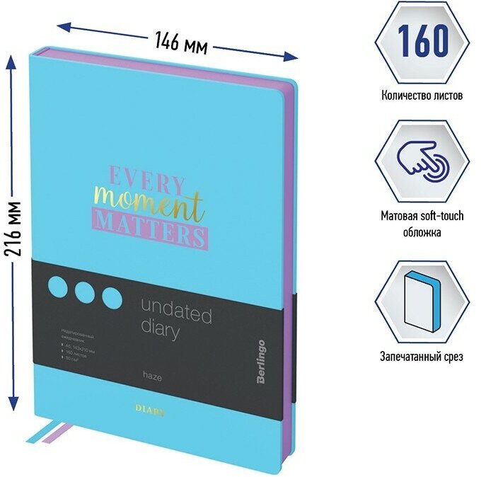 Ежедневник Berlingo Haze недатированный на 2022-2023 год, искусственная кожа, А5, 160 листов, голубой, цвет бумаги тонированный