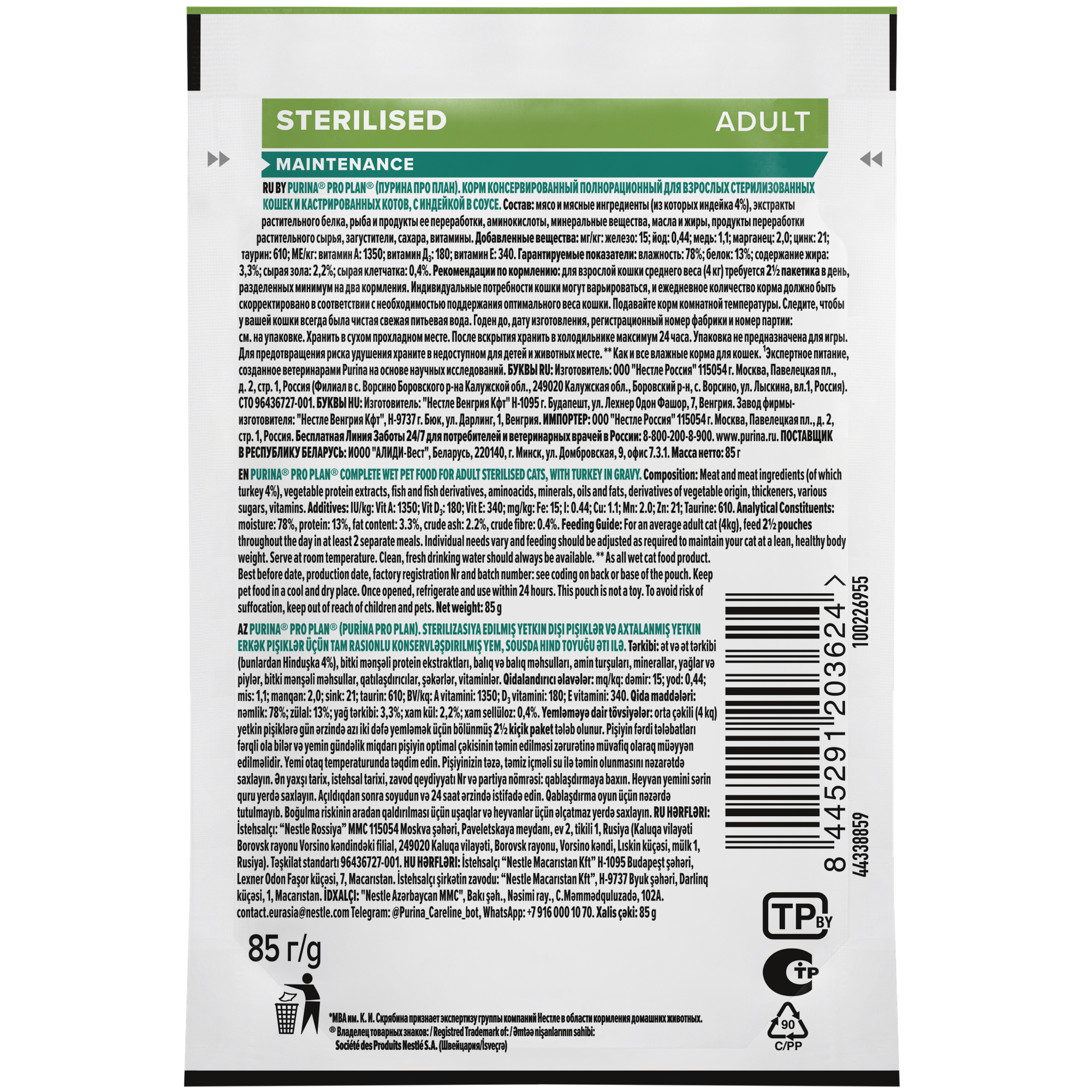 Влажный корм Pro Plan STERILISED для стерилизованных кошек и кастрированных котов, с индейкой в желе, паучи, 85г.*12шт.