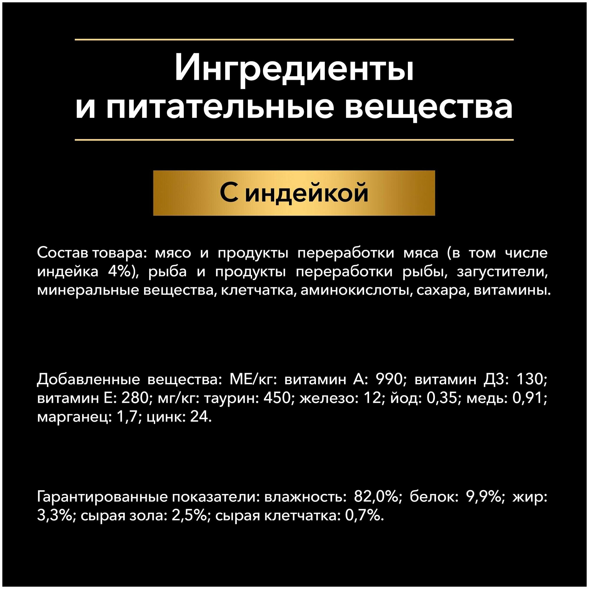 | Состав | мясо и продукты переработки мяса (в том числе индейка 4%), рыба и продукты переработки рыбы, загустители, минеральные вещества, клетчатка, аминокислоты, сахара, витамины |