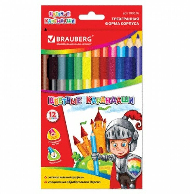 Карандаши цветные утолщенные BRAUBERG, 12 цветов, трехгранные, картонная упаковка, 180836, 1 шт