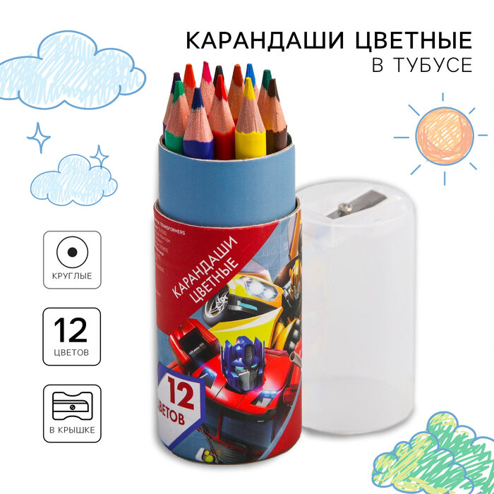 Карандаши цветные с точилкой в тубусе мини, 12 цветов, Transformers 5276455
