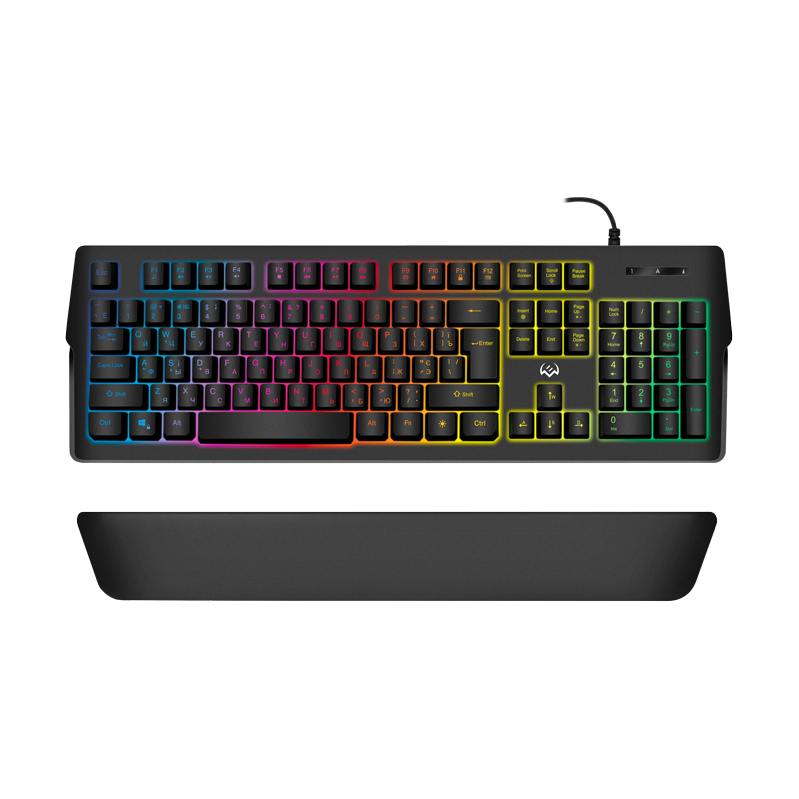 | Плюсы: | Красивая, настраиваемая подсветка через отдельное приложение, звук от нажатия клавиш, быстрый отклик, подставка для рук с магнитами, довольно длинный провод, звук отдалённо похож на механическую, качество сборки, доступная цена. |
