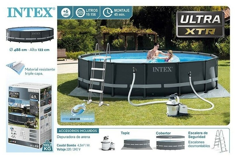 Каркасный бассейн Ultra XTR Frame 488х122см, с лестницей, фильтр-насосом, тентом и подстилкой, Intex, 26326
