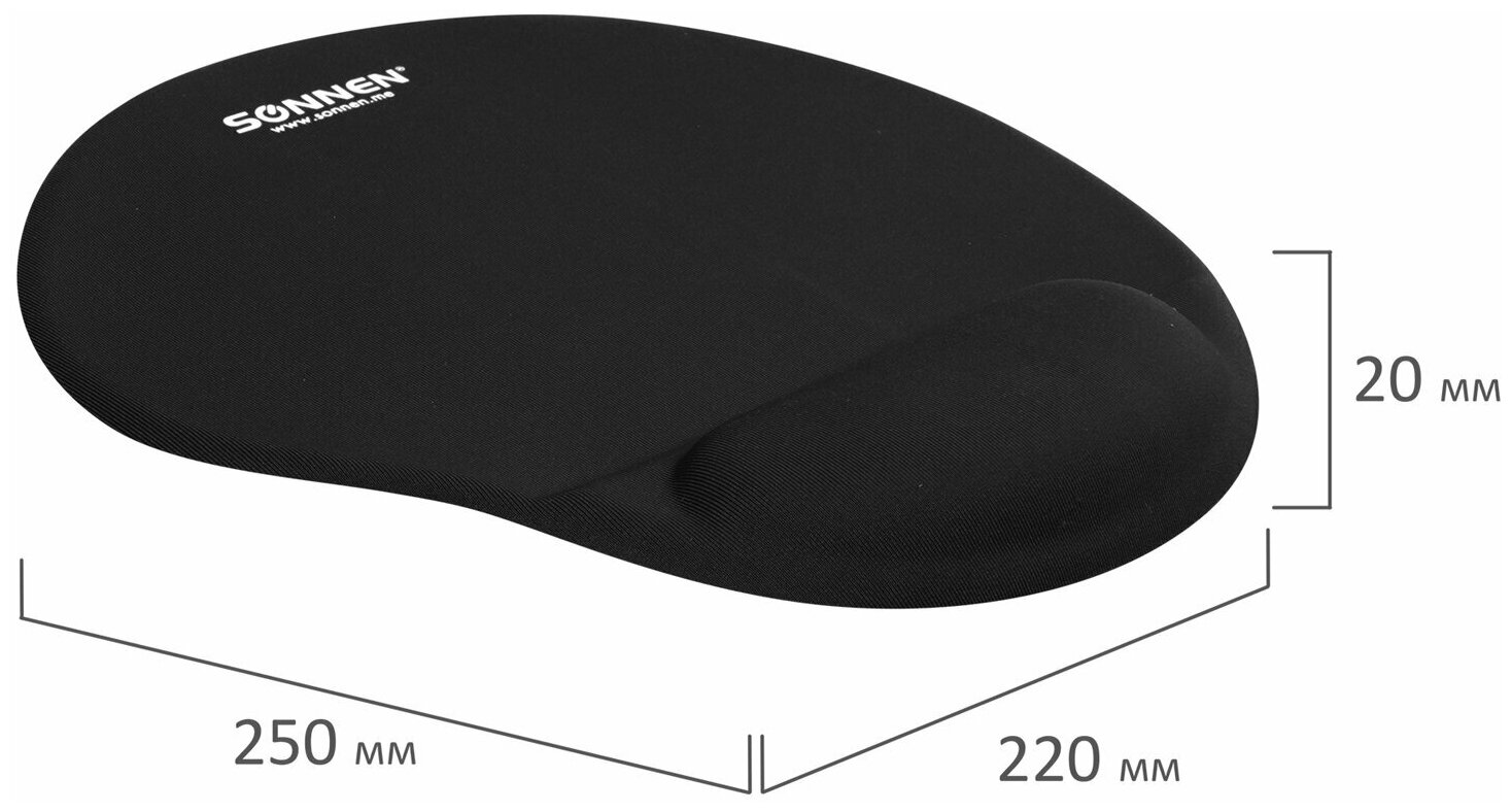 Коврик для мыши с подушкой под запястье SONNEN, полиуретан+лайкра, 250х220х20 мм, черный, 513299
