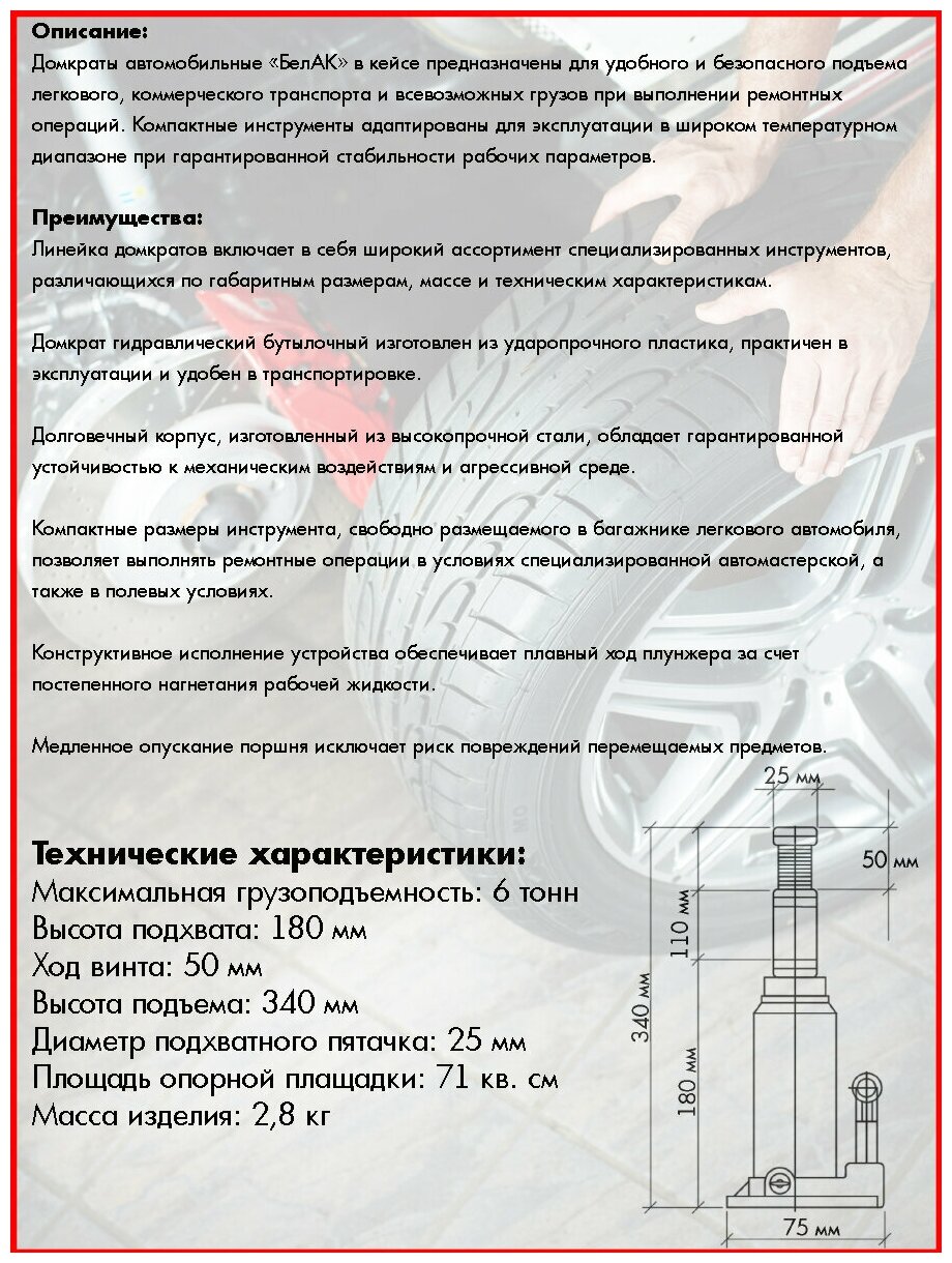 Белавтокомплект БАК.10043 Домкрат 6 тонн в кейсе "БелАК" (180мм-340мм) интересное: