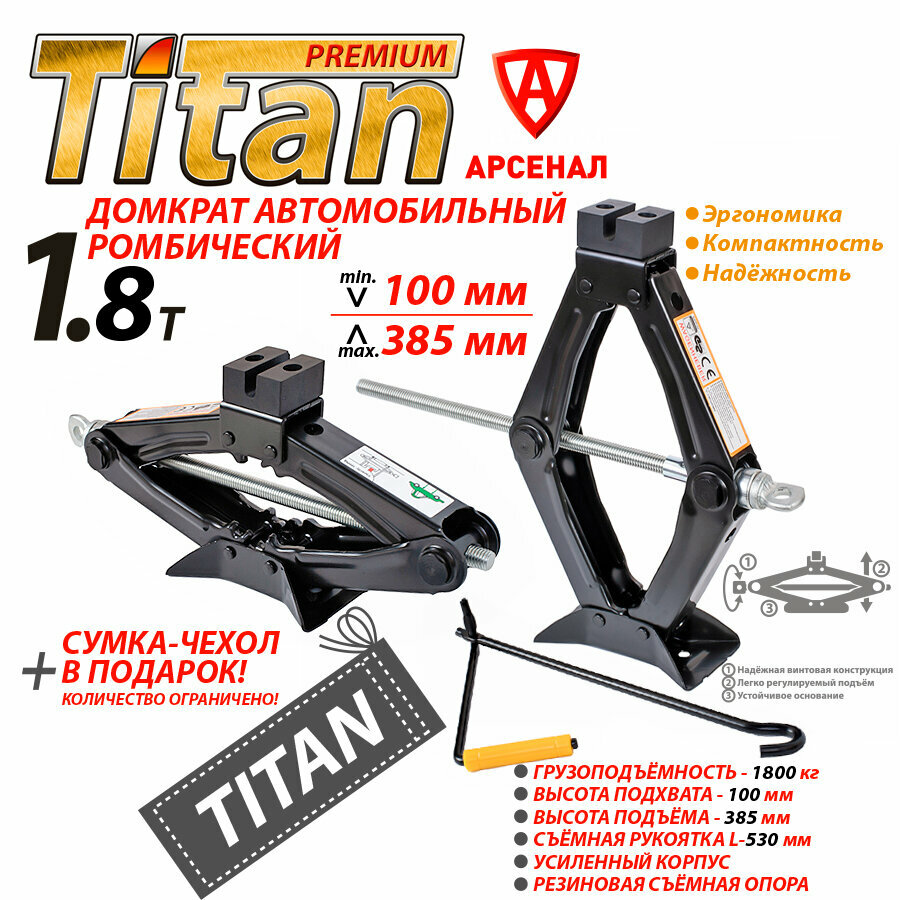 Домкрат ромбический 1,8 т. (100-385мм) сумка-чехол в подарок! Механический автомобильный Titan, CT105BR