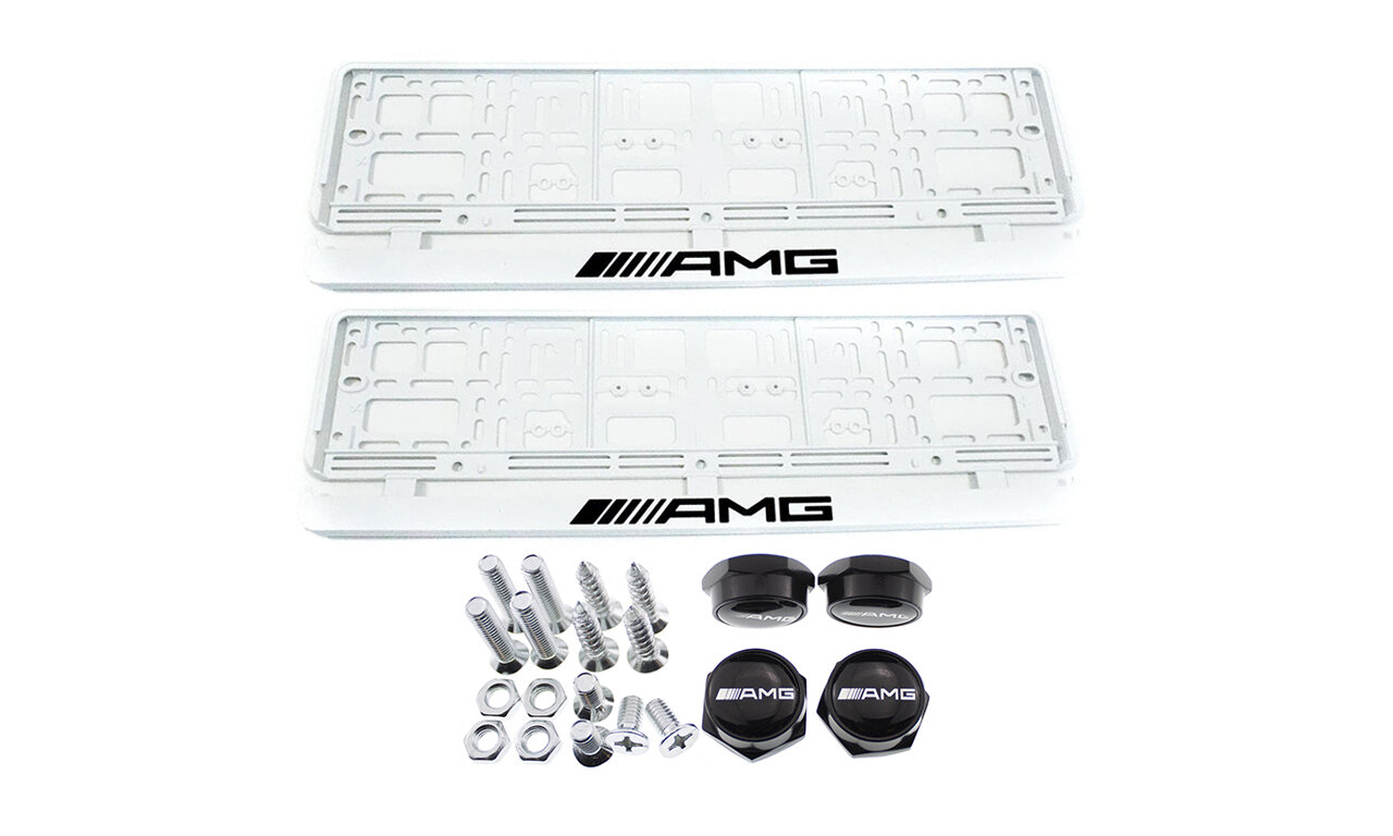 Комплект: пластиковая рамка для гос. номера для AMG Белый 2шт. плюс болты для номерных знаков для AMG черный 4шт.