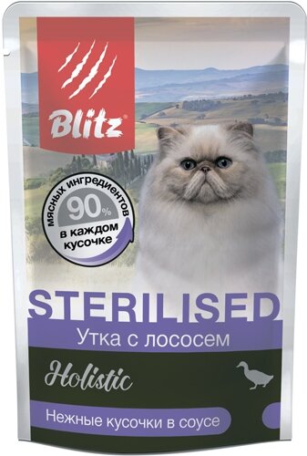 BLITZ Holistic Консервы для стерилизованных кошек и кастрированных котов Утка с лососем в соусе пауч 24х85гр