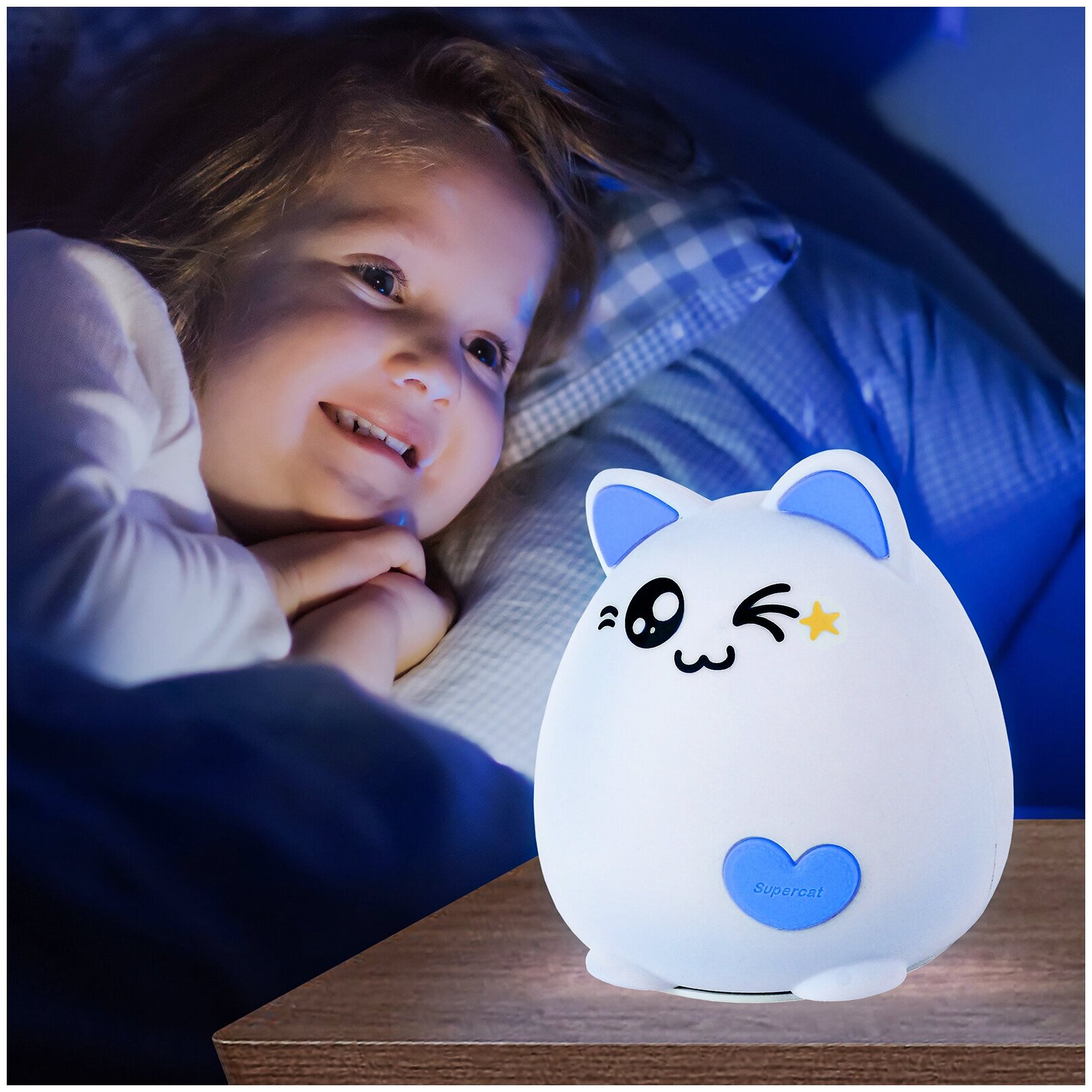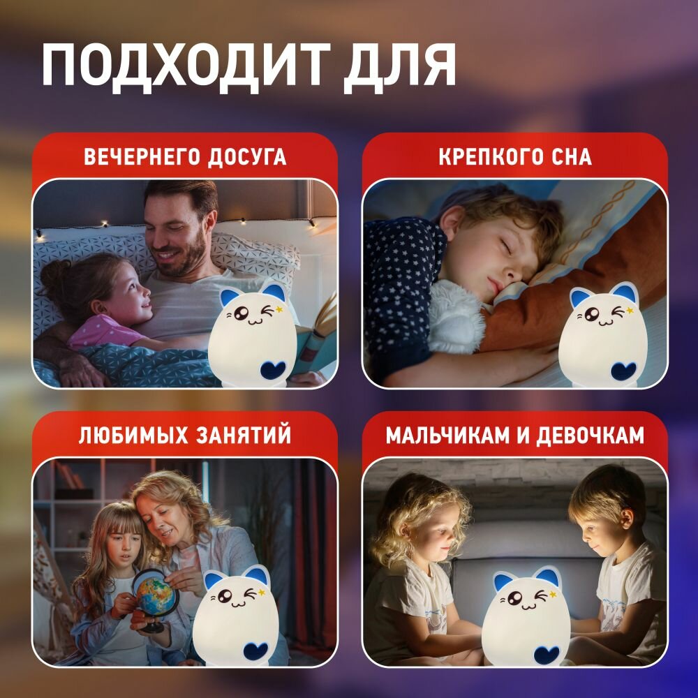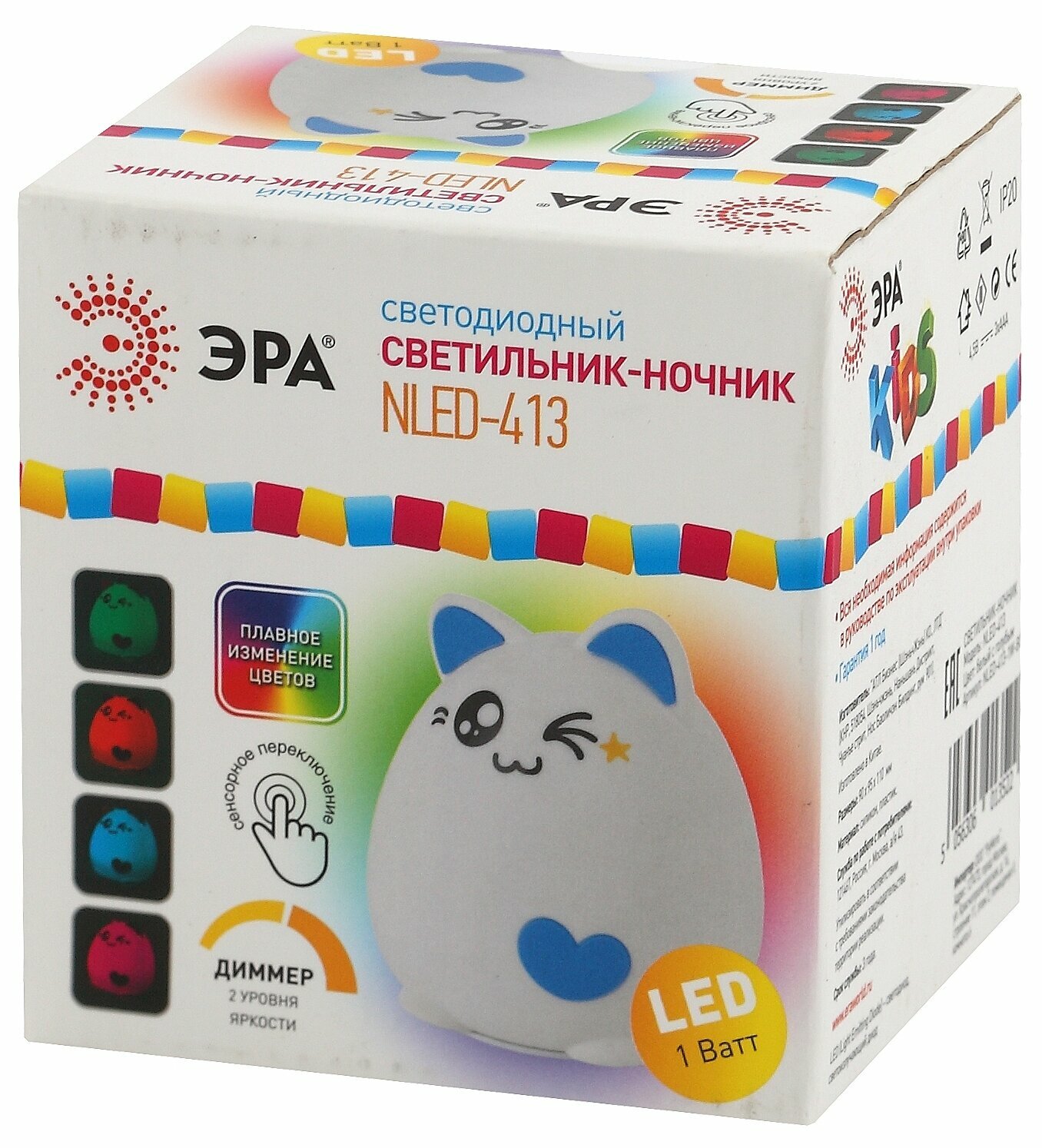 ЭРА ночник св/д детский мягкий 1W NLED-413-1W-BU белый с синим котик, сенсор, RGB (3хААА) 3522