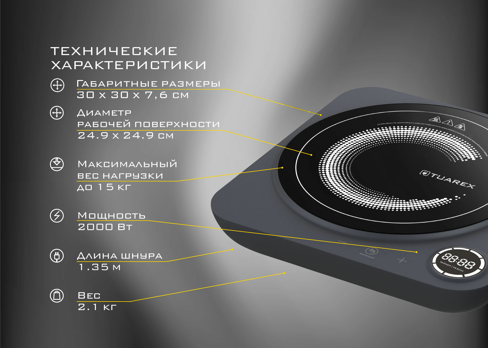 Индукционная плитка настольная электрическая TUAREX TK-2727 / 2000 Вт / до 15 кг / до 240 градусов / 8 режимов мощности