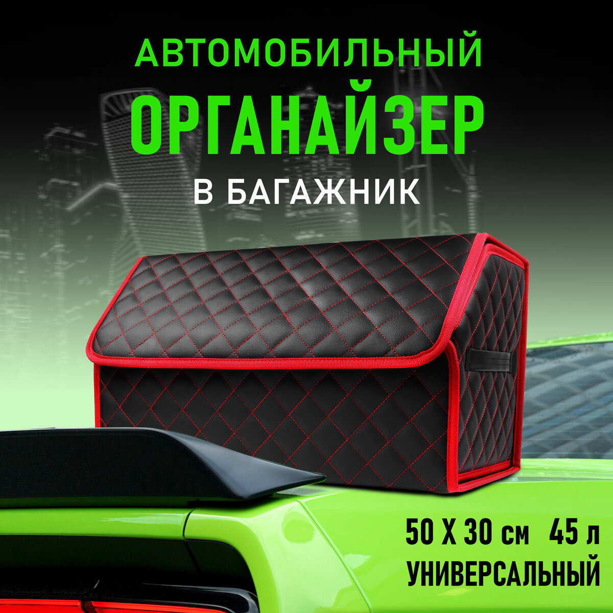 CarCape/Органайзер в багажник автомобиля. Автомобильный бокс для хранения. Модель Classic ромб 50*30см/ Черный, красная строчка