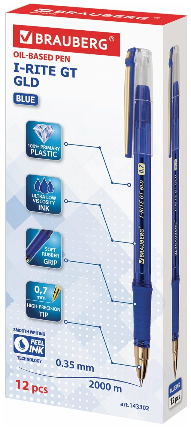Ручка шариковая масляная с грипом BRAUBERG "i-Rite GT GLD", синяя, корпус тонированный синий, узел 0,7 мм, 143302 (арт. 143302)