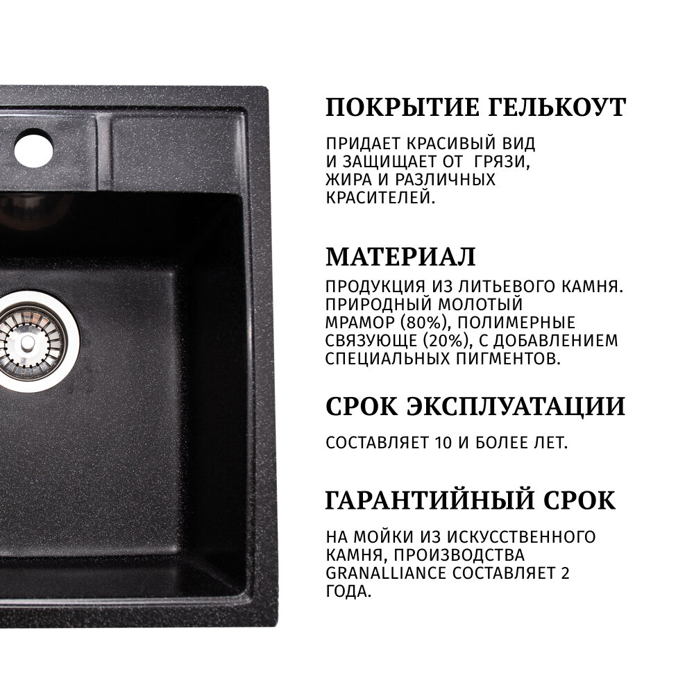 Врезная кухонная мойка из искусственного камня, GranAlliance G20 (49,7*44 см), чёрный