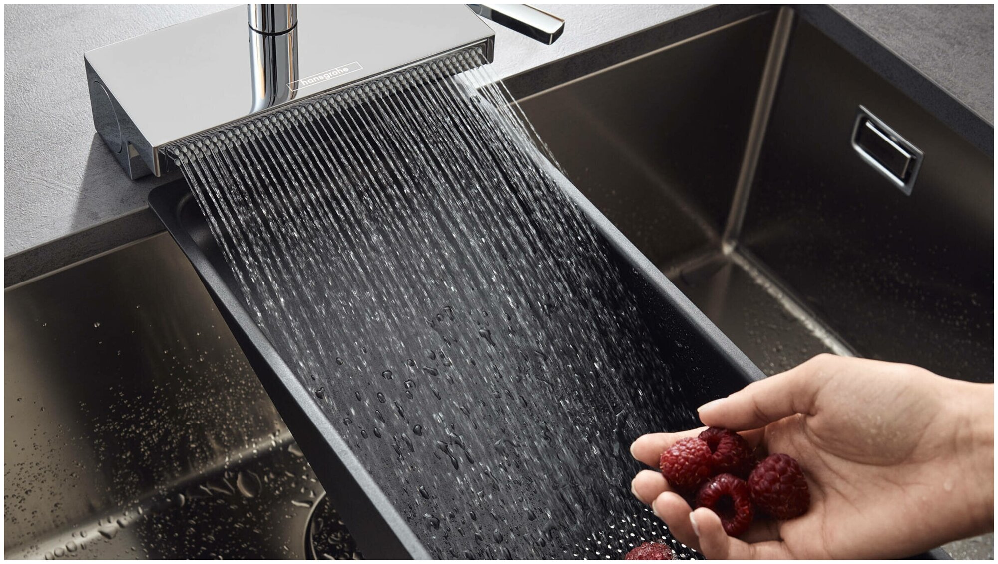 СохранитьСмеситель для кухни с выдвижной лейкой Hansgrohe Aquno Select M81, арт. 73830000, 2 режима, с многофункциональным дуршлагом интересное:
