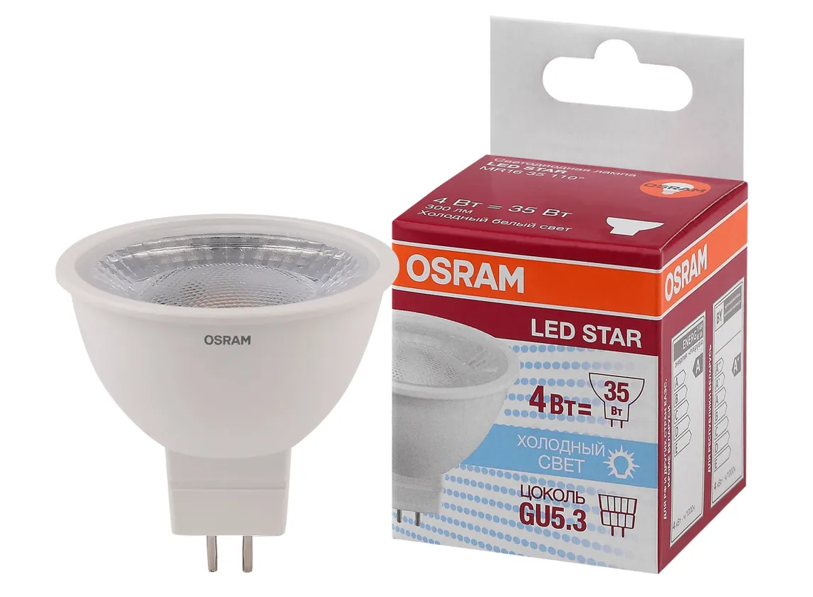 СохранитьЛампа светодиодная OSRAM LED Star MR16, 300лм, 4Вт , 4000К, нейтральный белый свет, Софит, Цоколь GU5.3 интересное: