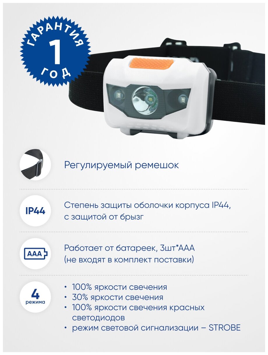 Фонарь налобный светодиодный, работающий от батареек 3*AAA, 1LED+2RED, IP44, пластик, TH2302
