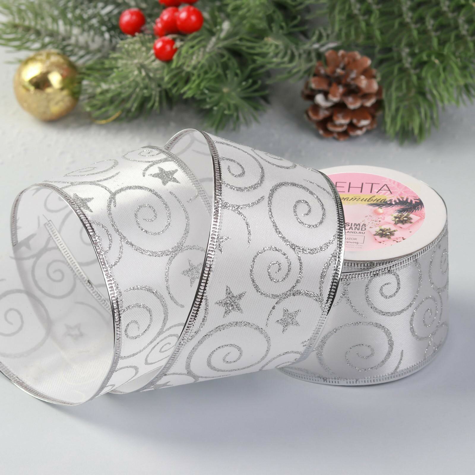 Купить Лента атласная с металлической нитью «Узоры со звездой», 60 мм, 9 ± 0,5 м, цвет белый/серебряный