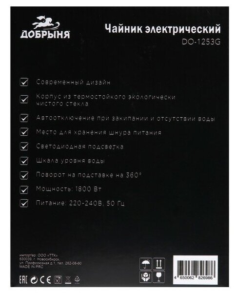 Чайник стеклянный 1.8л черный 1800Вт DO-1253 Добрыня (1/12)