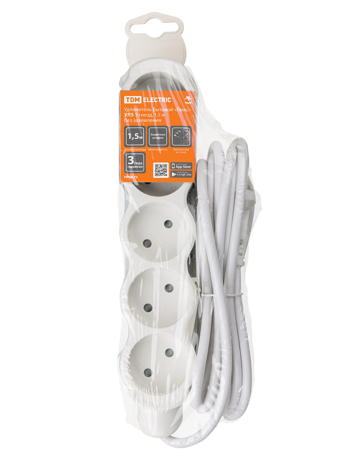 Удлинитель электрический "Люкс" УЛ03 TDM 3 гнезда с защитной шторкой, с заземлением, кабель 1,5 м, белый