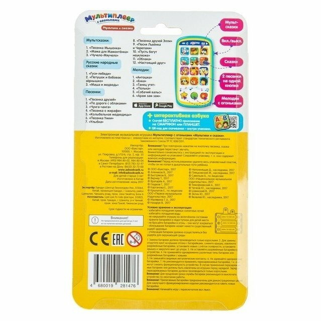 | Отзыв: | В телефоне 6 сказок и 6 песен, кнопки внизу светятся, ребенку очень нравится |