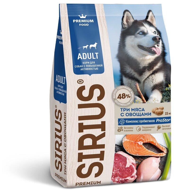 Сухой корм SIRIUS PREMIUM, Сириус для собак с повышенной активностью, три мяса с овощами, 2 кг