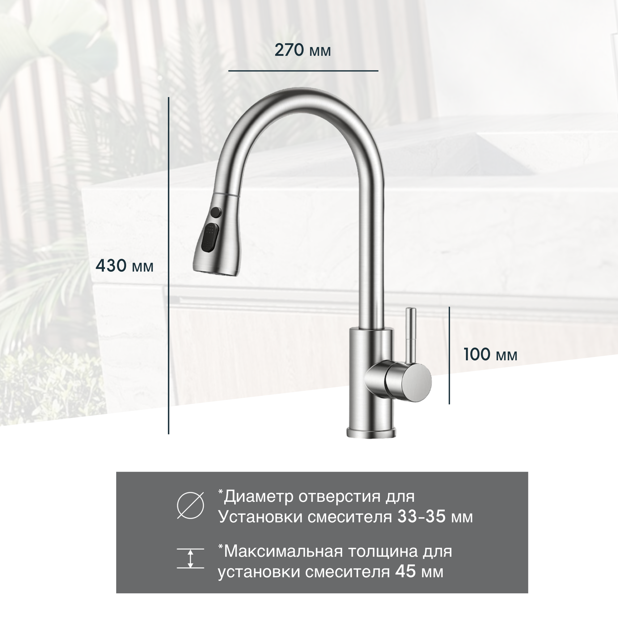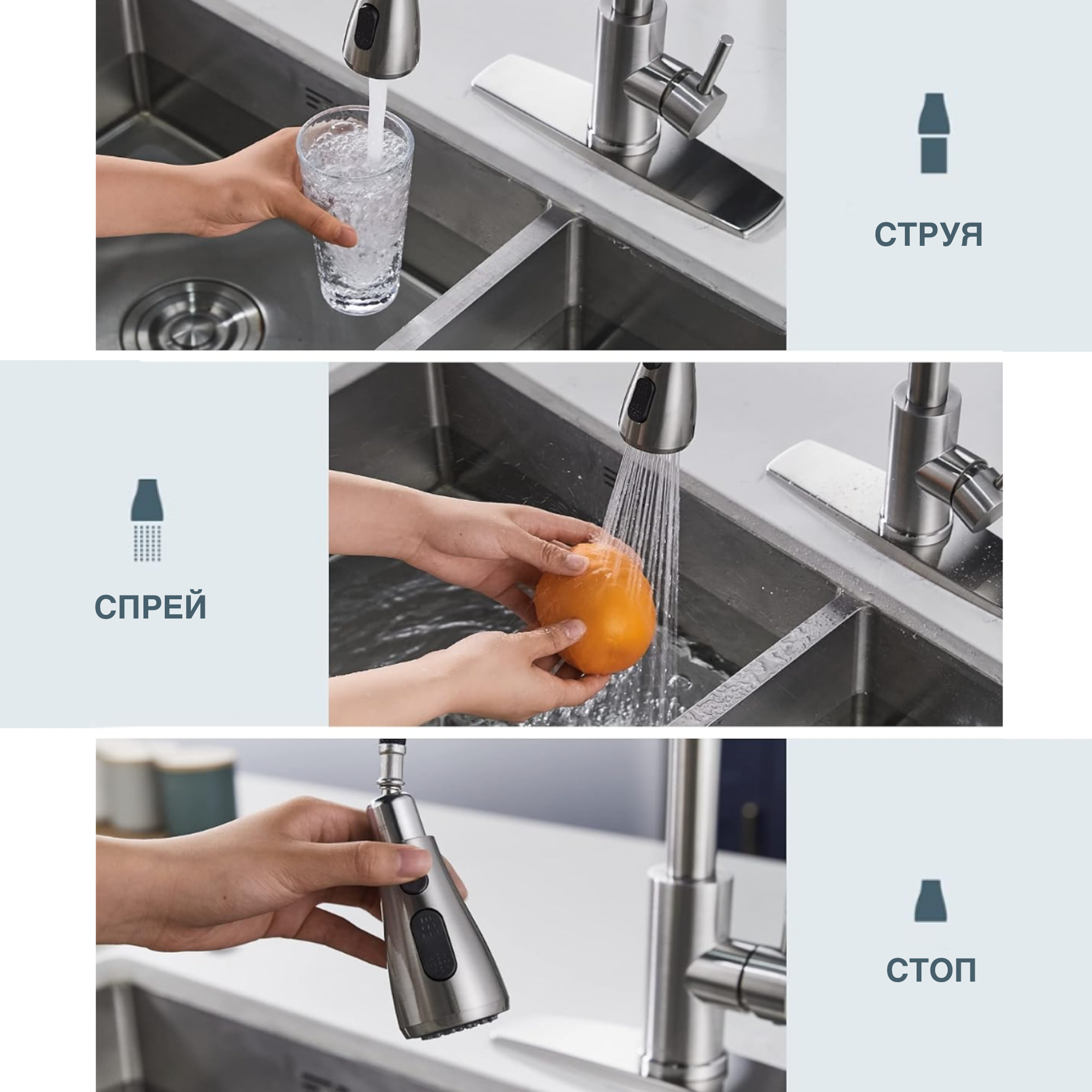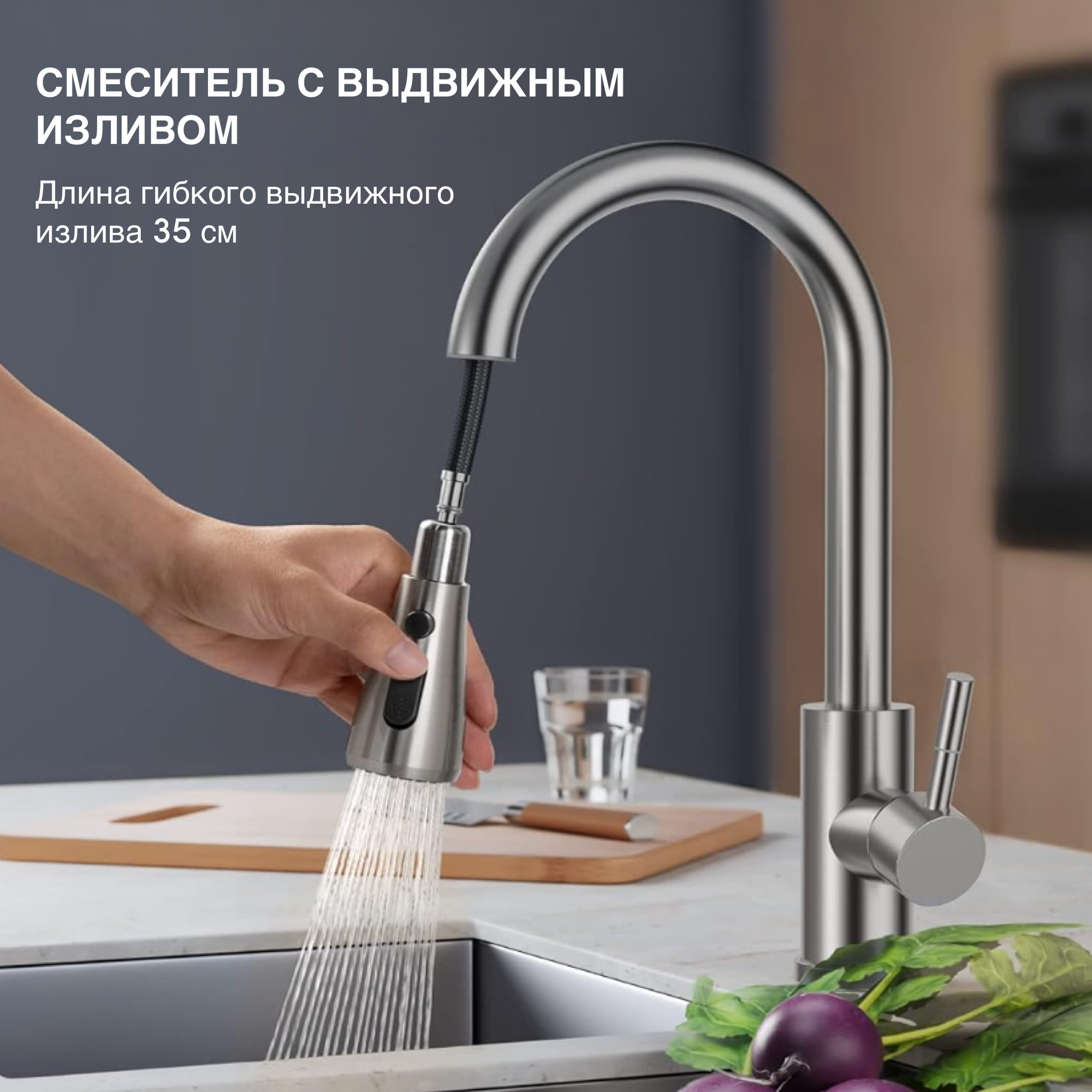 Смеситель для кухни SHIMIZU High-pull с выдвижным изливом и режимом душ, сатин интересное: