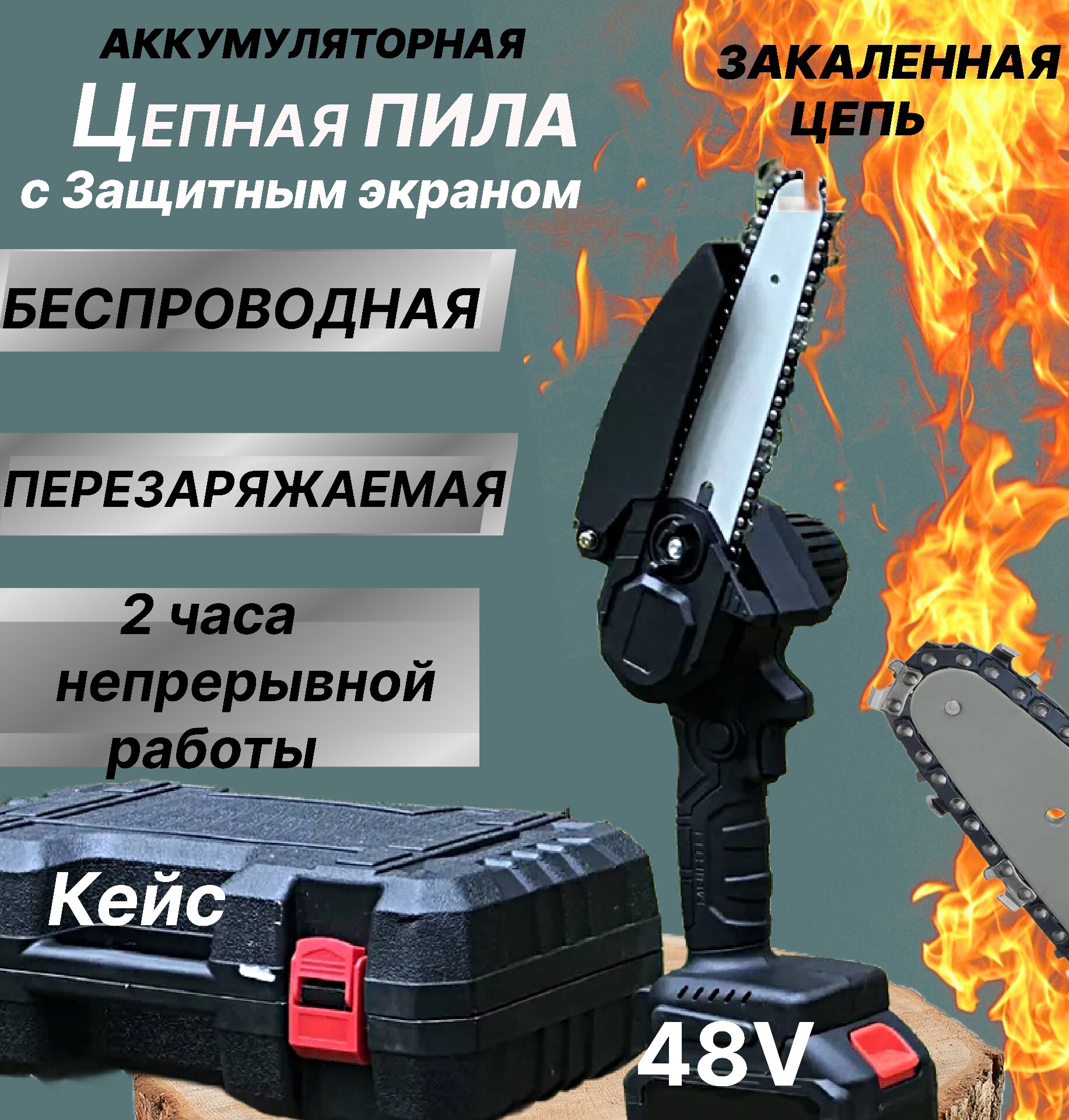 Купить Туристическая пила цепная аккумуляторная / Электропила 48V Кейс/ Мини пила для строительства и садоводства /Кусторез Защитный кожух