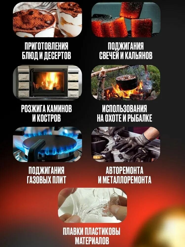 | Минусы: | очень маленькое пламя даже на максимальном положении, но оно стабильное не как у зажигалки |
