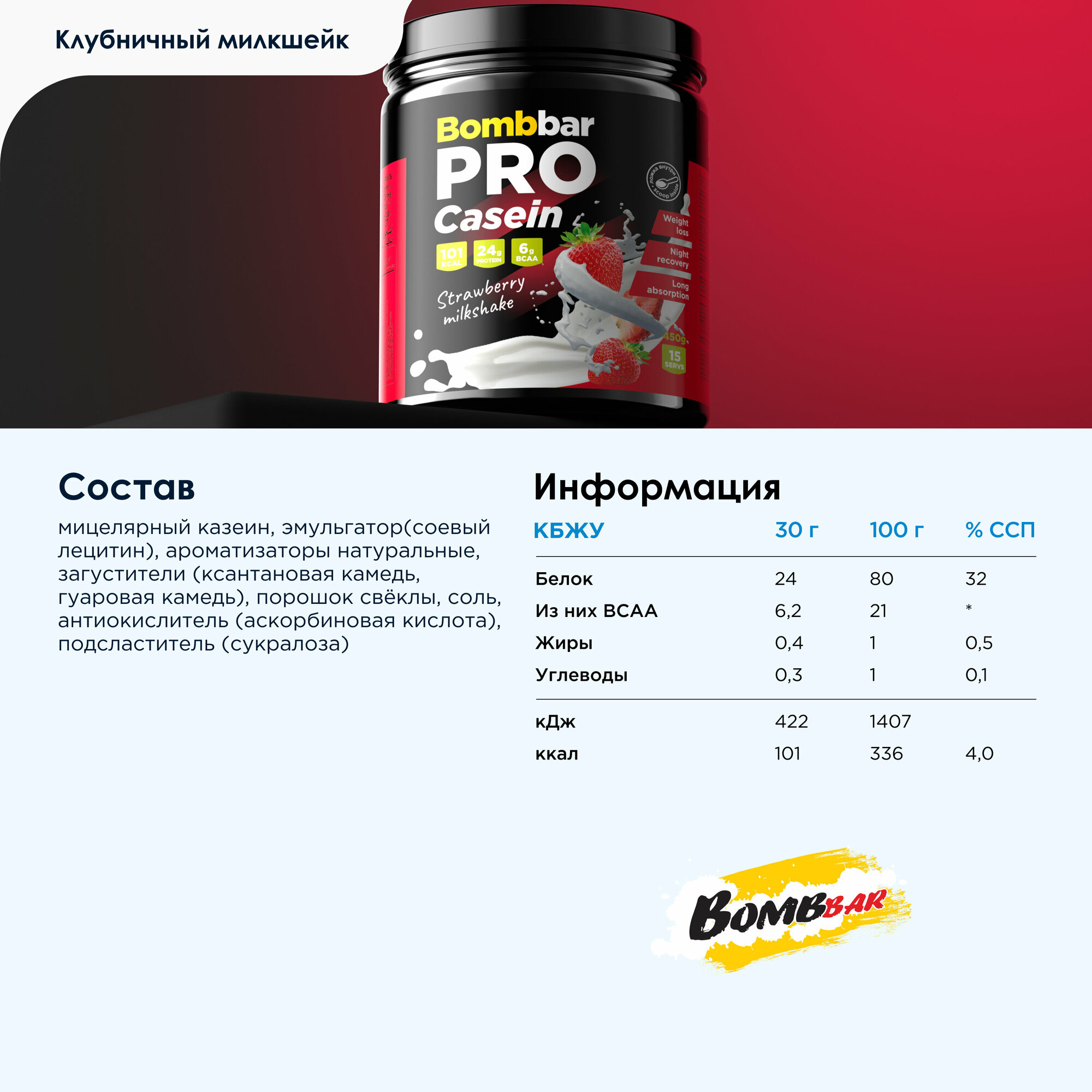 Bombbar Pro Casein (450 гр) (клубничный милкшейк)