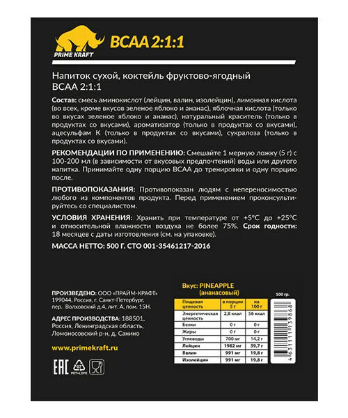 Prime Kraft BCAA 2.1.1, 500 g (ананас)
