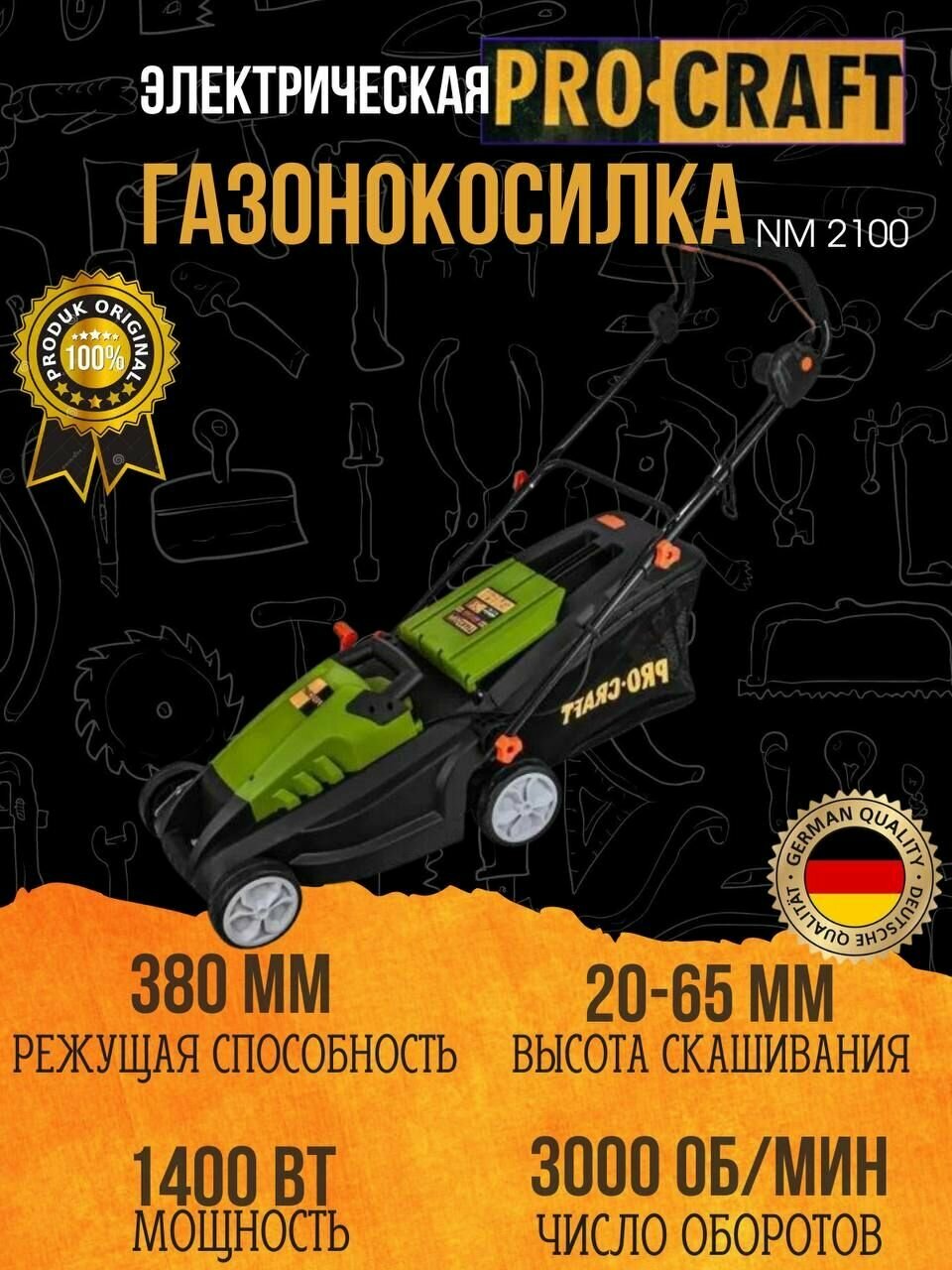 Электрическая газонокосилка ProCraft NM2100, 2100 Вт, 38 см