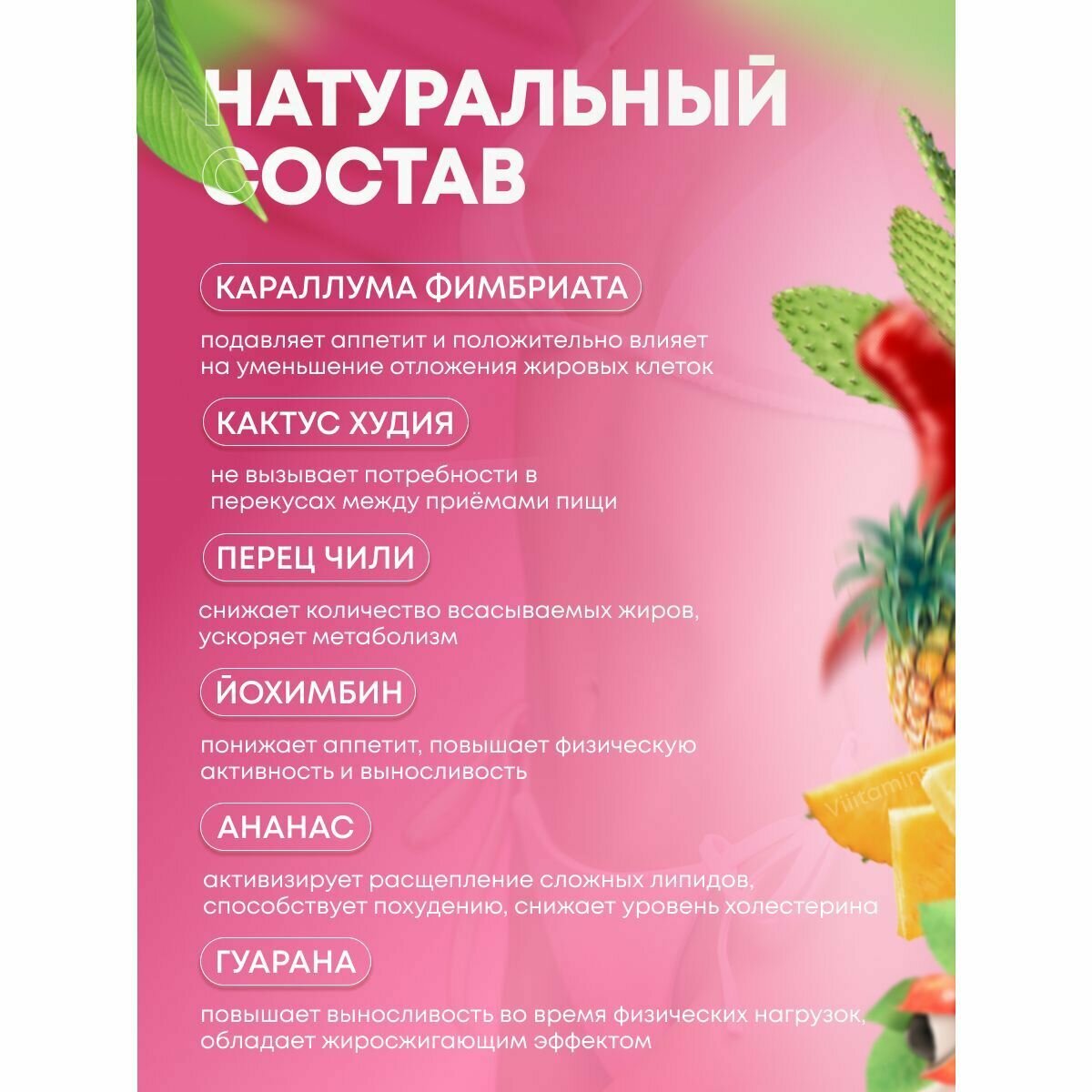 | Дополнительная информация | Помогает организму избавиться от лишнего веса до 20 кг, отбивает интерес к сладкому, препятствует набору весу |