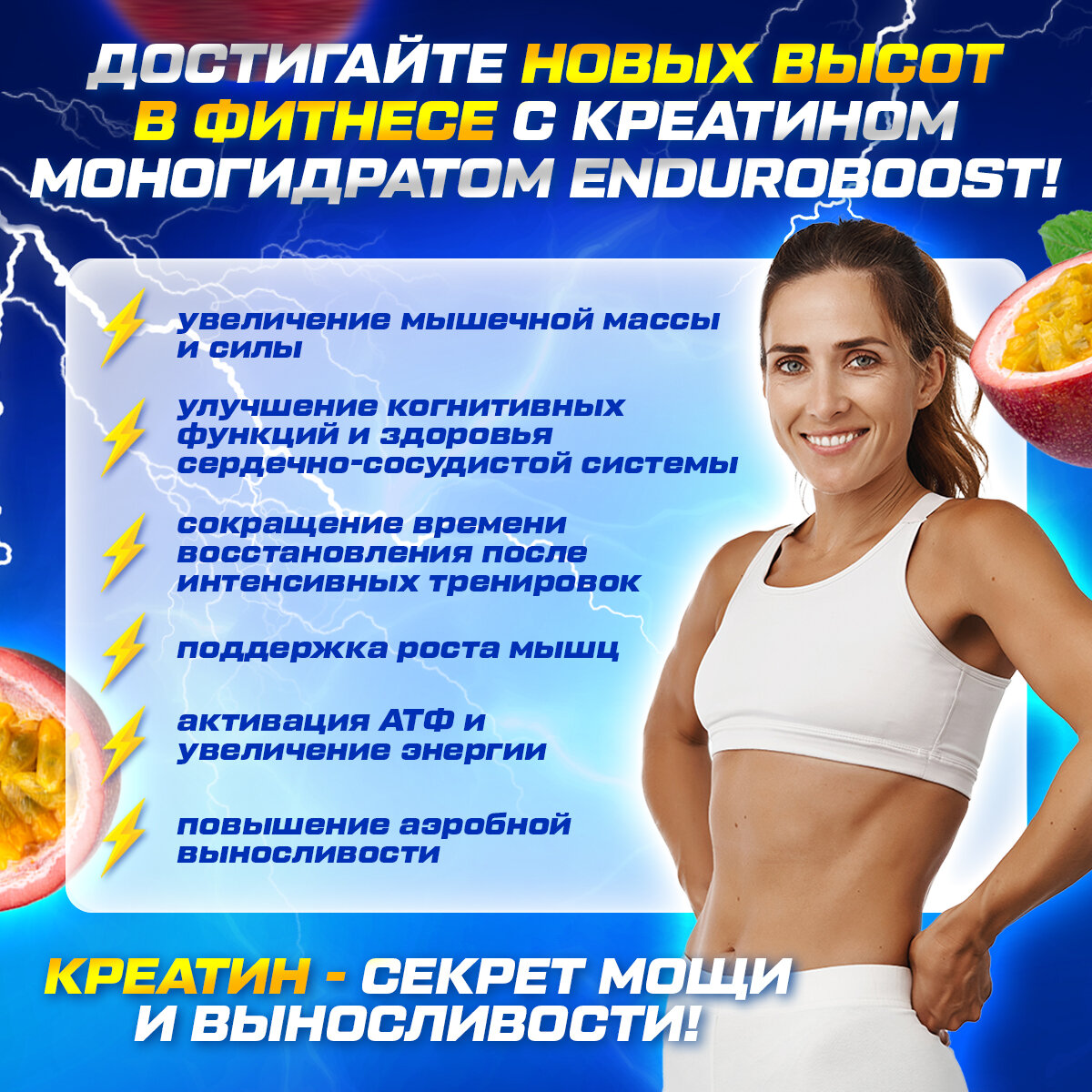 Купить Креатин моногидрат со вкусом маракуйя порошок 200 гр 40 порций, спортивное питание для набора мышечной массы