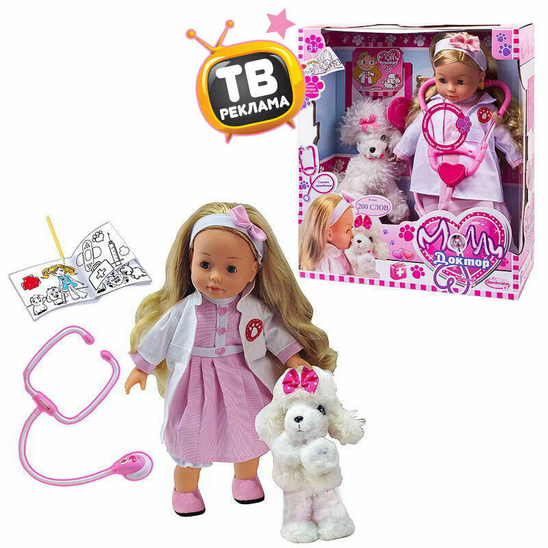 Купить Кукла DIMIAN Molly Доктор со стетоскопом и собачкой, говорит 200 слов, частично мягконабивная, 40 см