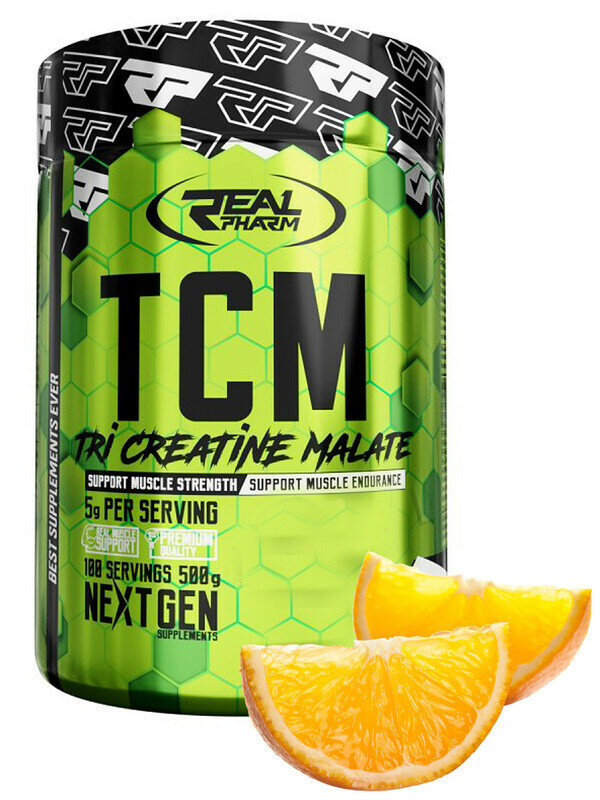 Купить Три-креатин малат Real Pharm, TCM, порошок 500г (Апельсин) / 100 порций / Для набора мышечной массы и выносливости, мужчин и женщин