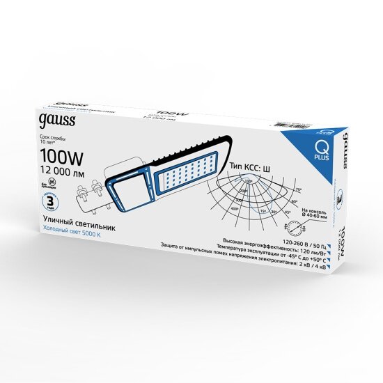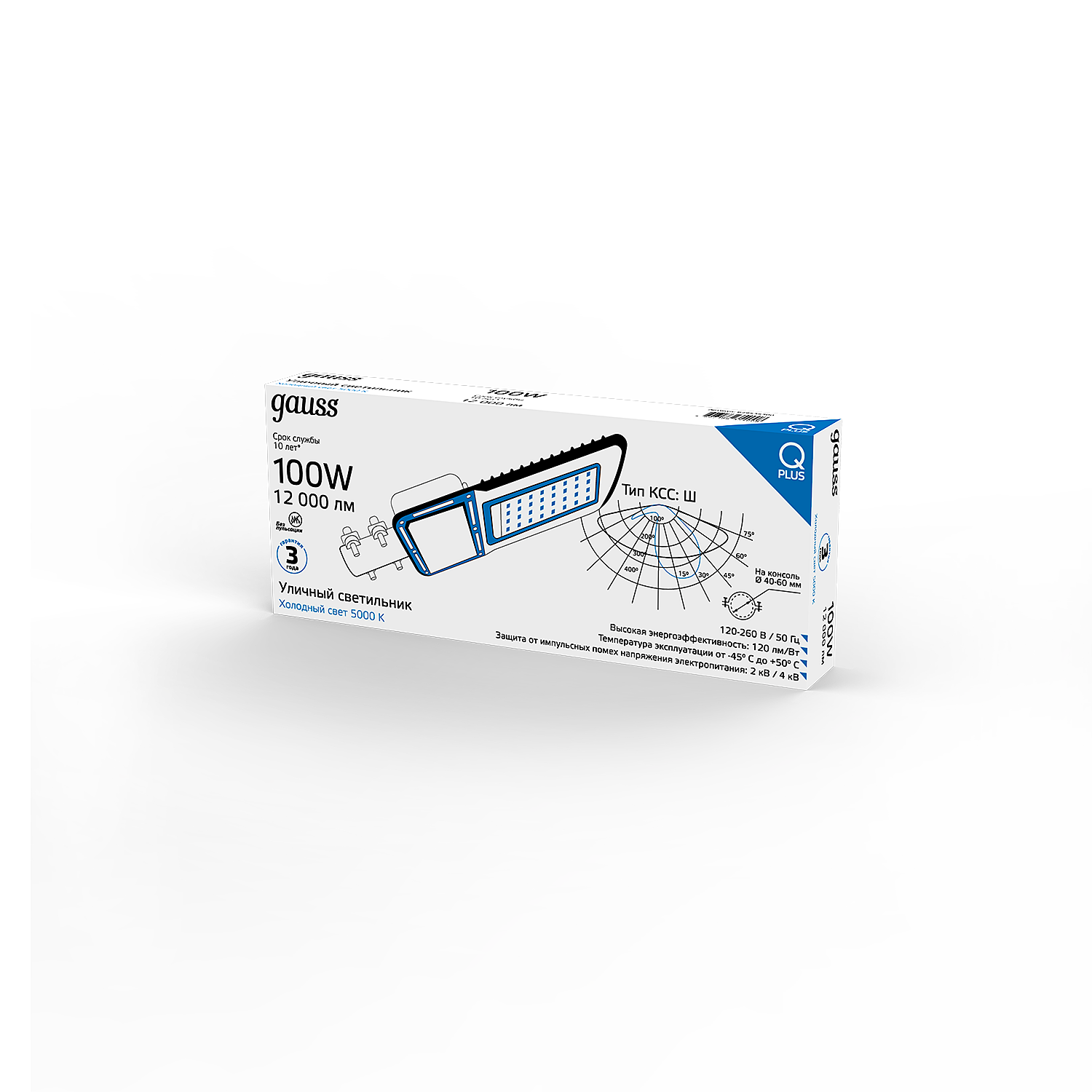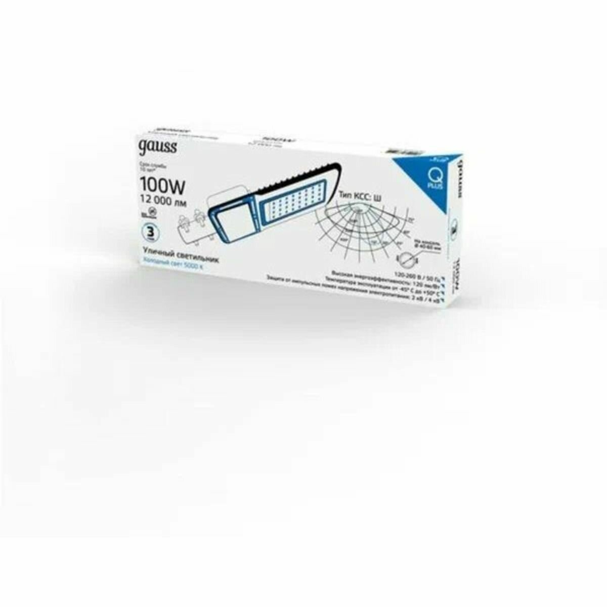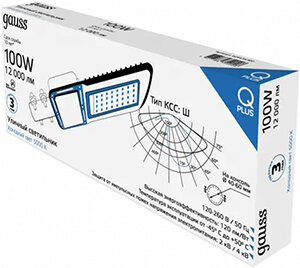 Gauss Светильник уличный Qplus 100W 12000lm 5000K 120-260V IP65 455*180*49мм черный КСС "Ш" LED