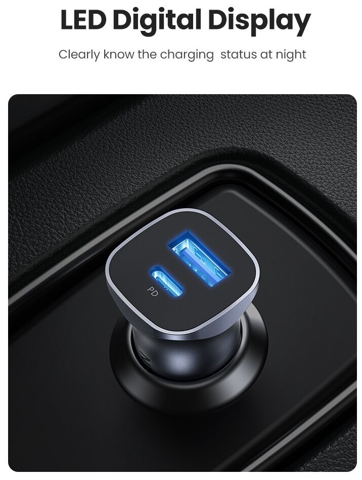 Автомобильное зарядное устройство UGREEN CD130 (40858) USB-C PD+USB-A QC 30W Fast Car Charger + SCP22.5W. Цвет: серый.