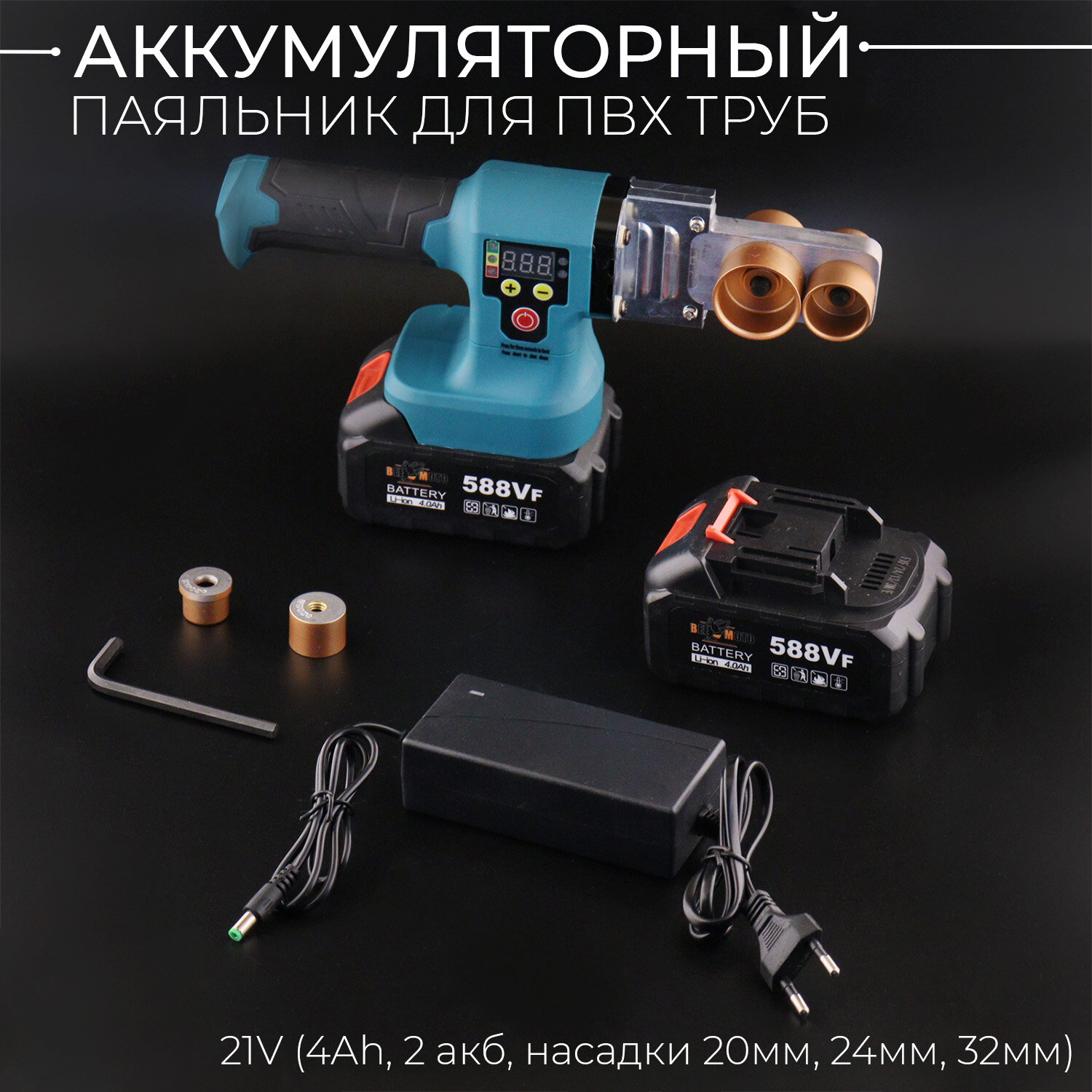 Купить Аккумуляторный паяльник для ПВХ труб 21V (4Ah, 2 акб, насадки 20мм, 24мм, 32мм) "BEEZMOTO"