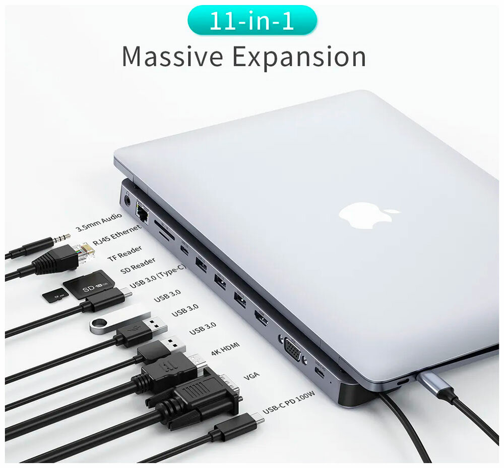 СохранитьUSB-концентратор (хаб) Choetech 11 в 1, 4 x USB 3.0, 1 x USB-C PD, 1 x 4K HDMI, 1 x VGA, 1 x RJ45, 1 x jack 35 mm, 2 x SD/Micro SD (HUB-M20-GY) интересное:
