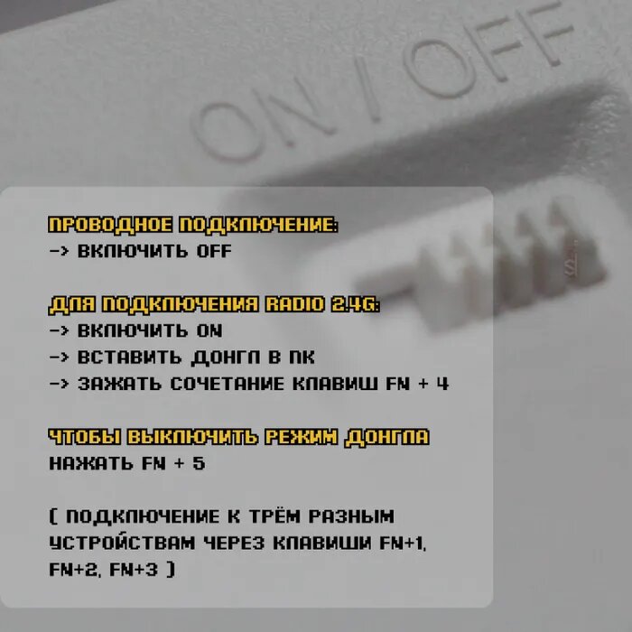 | Отзыв: | FN+5 проводной режим, FN+1-3 переключение между устройствами, FN+4 вроде как на адаптер, которого в комплекте нет.