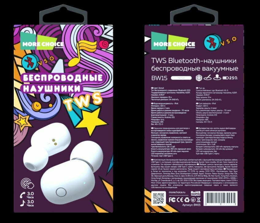 Беспроводные наушники MORE CHOICE BW15 24-24,8 кГц, белый