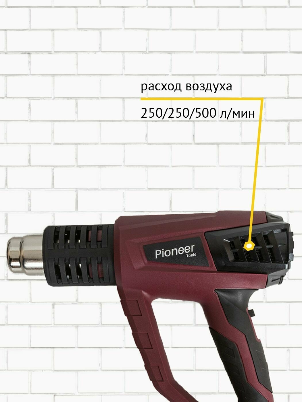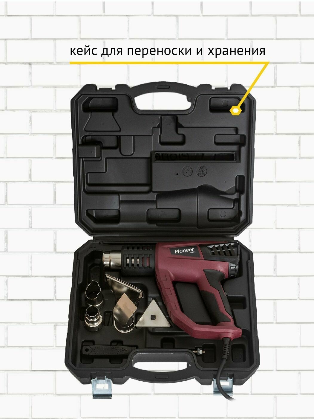 Купить Фен строительный Pioneer с щеточным двигателем, 6 уровней регулировки температуры, нагрев за минуту, 4 насадки + скребок, 2000 Вт