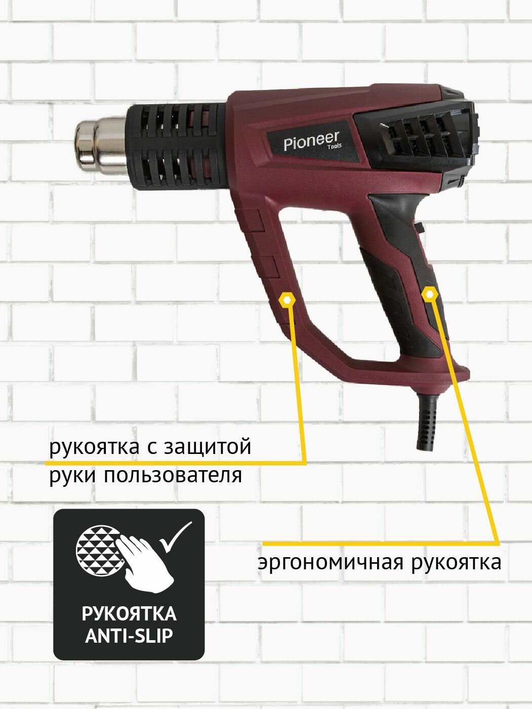Фен строительный Pioneer с щеточным двигателем, 6 уровней регулировки температуры, нагрев за минуту, 4 насадки + скребок, 2000 Вт интересное: