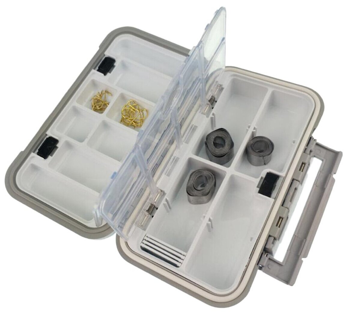 | Минусы: | Уплотнение. Оно есть, но функции свои не выполняет не полностью. Прилегает точечно. Есть щели соответственно герметичность под вопросом, да и нужна ли она если это коробка для приманок, ведь крючки должны высыхать. |